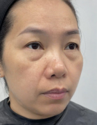 患者年龄:50岁 患者项目:不开刀去眼袋+提眉术 术前情况: △去眼袋手术前 这位患者来做手术的时候是瞒着女儿和丈夫的,她说他们都不同意,说她是花...